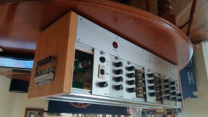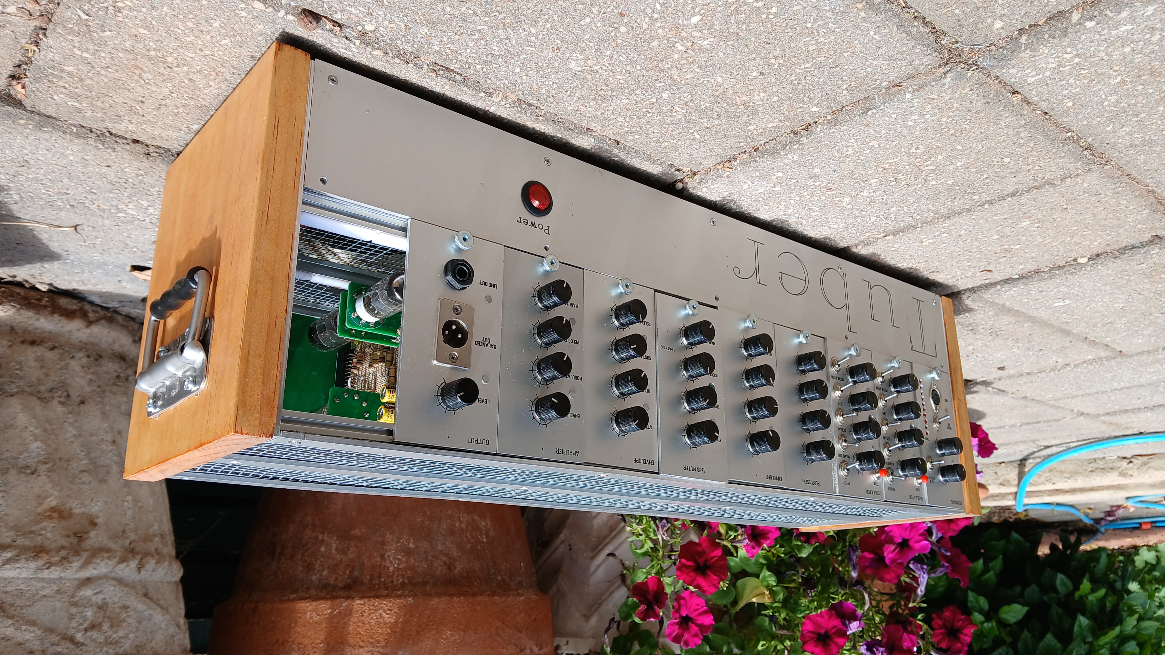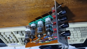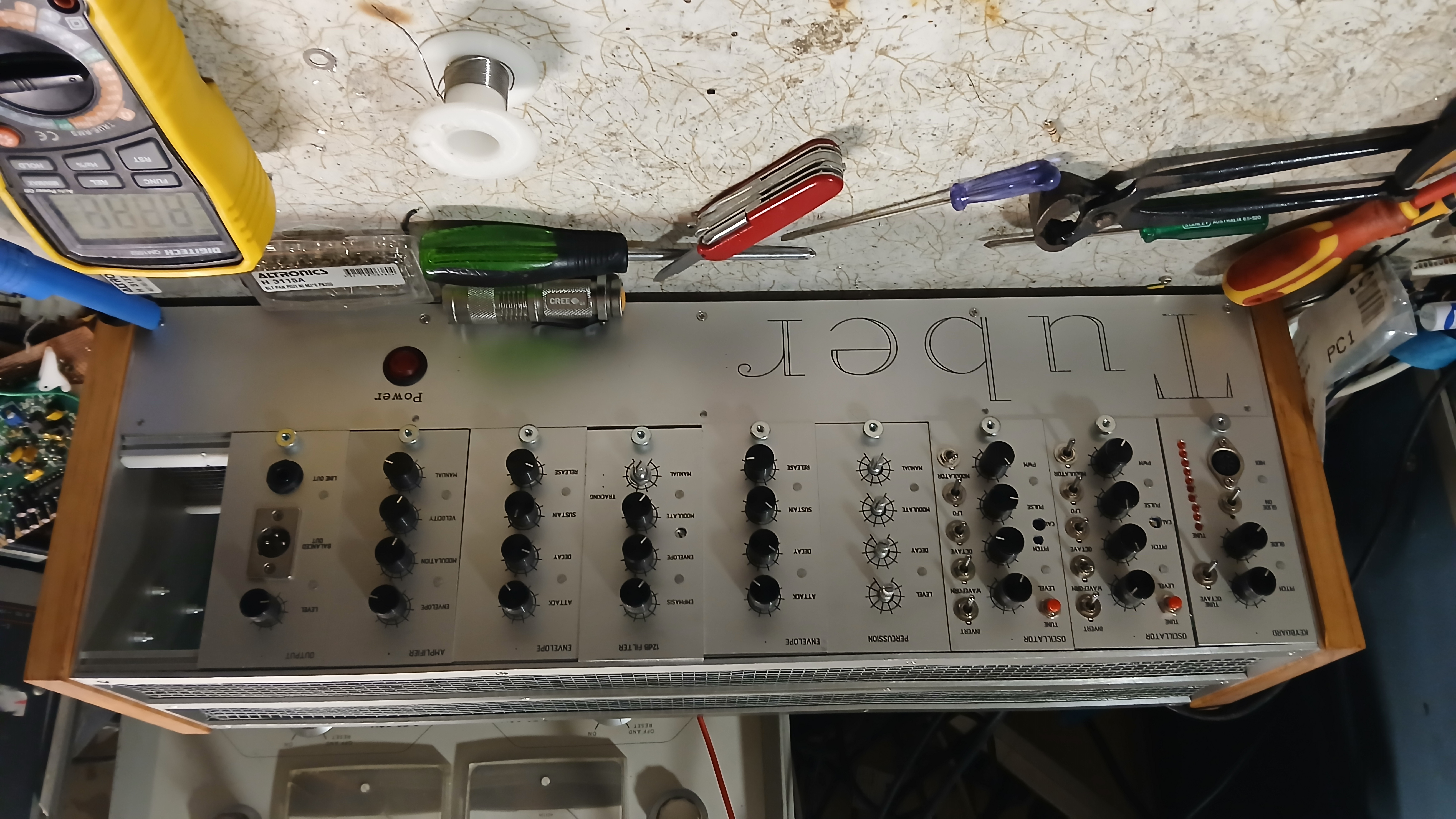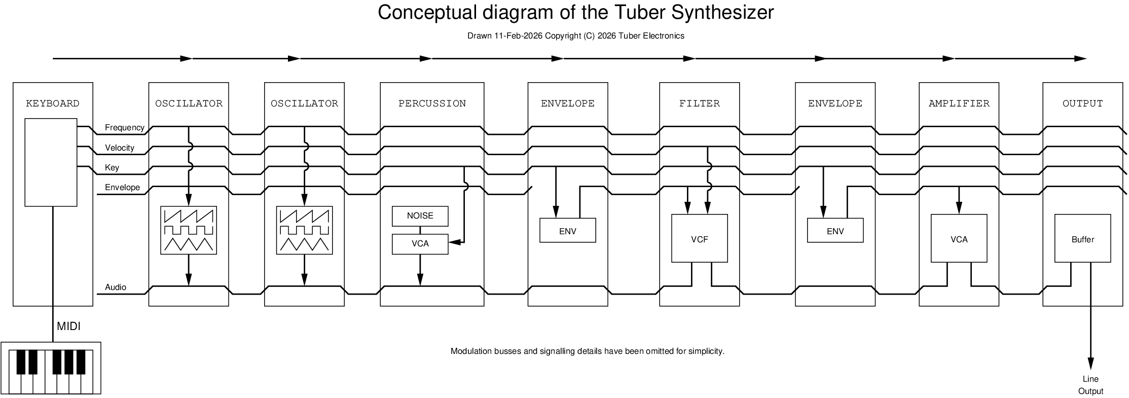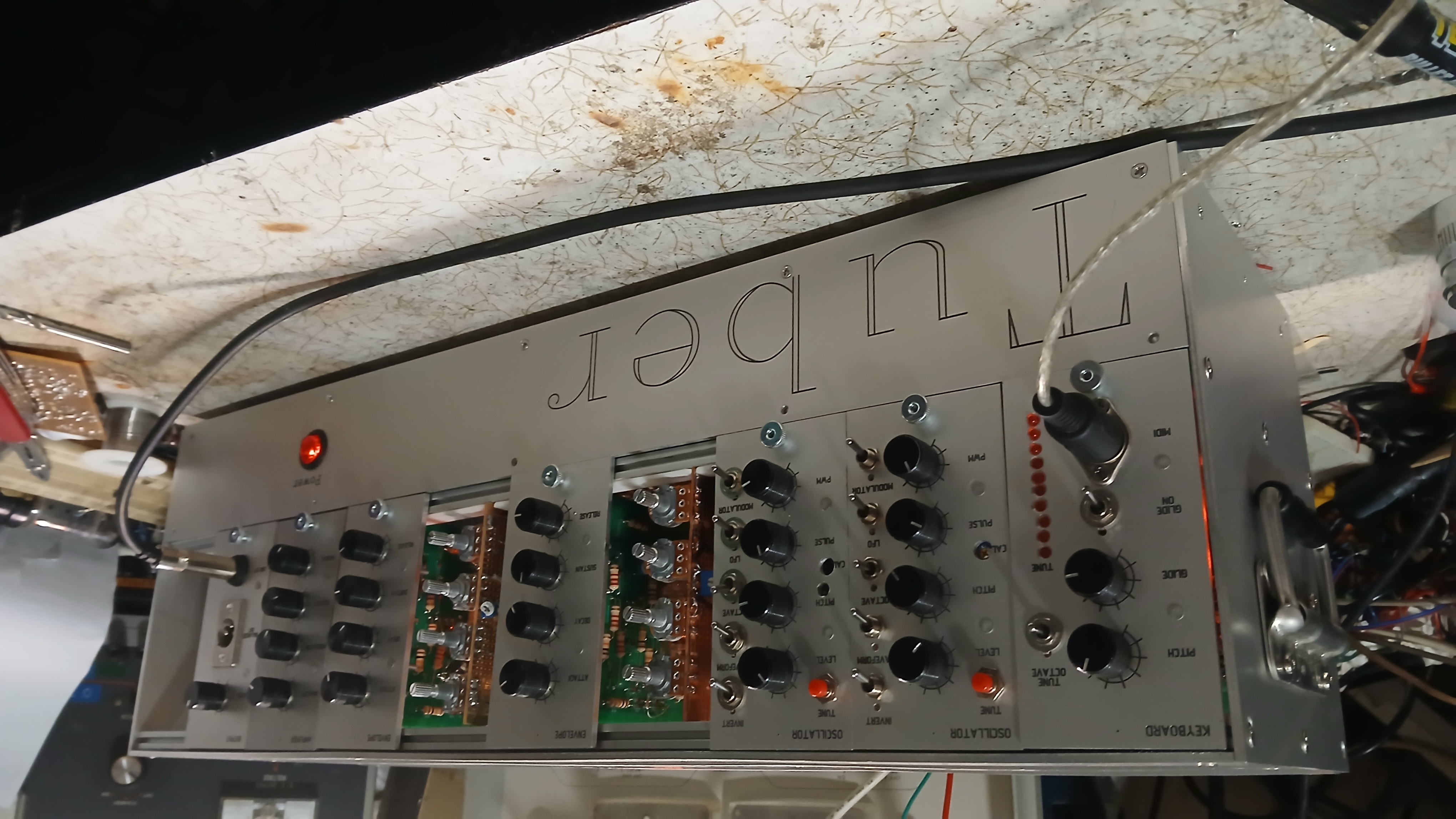 The Tuber Synthesizer is a valve, subtractive, monophonic, semi-modular synthesizer. It uses a Phantastron based voltage controlled oscillator and a four valve Sallen-Key voltage controlled filter.