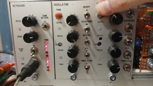 The modular system allows for modules to be rearranged along the signal path, but without the need for patch cables. The current system has a keyboard controller, two Phantastron oscillators, a noise and percussion generator, two envelope generators, a 12dB voltage controlled Sallen-Key filter and a voltage controlled amplifier. A third oscillator will be built in the future.