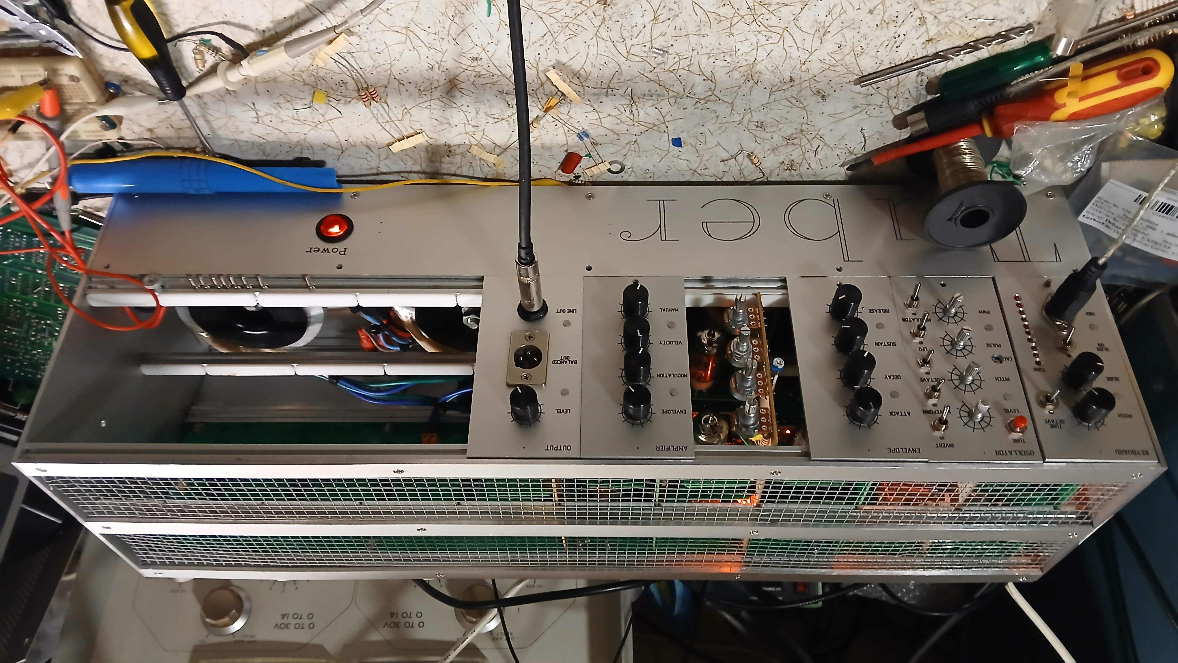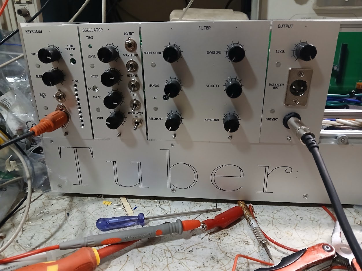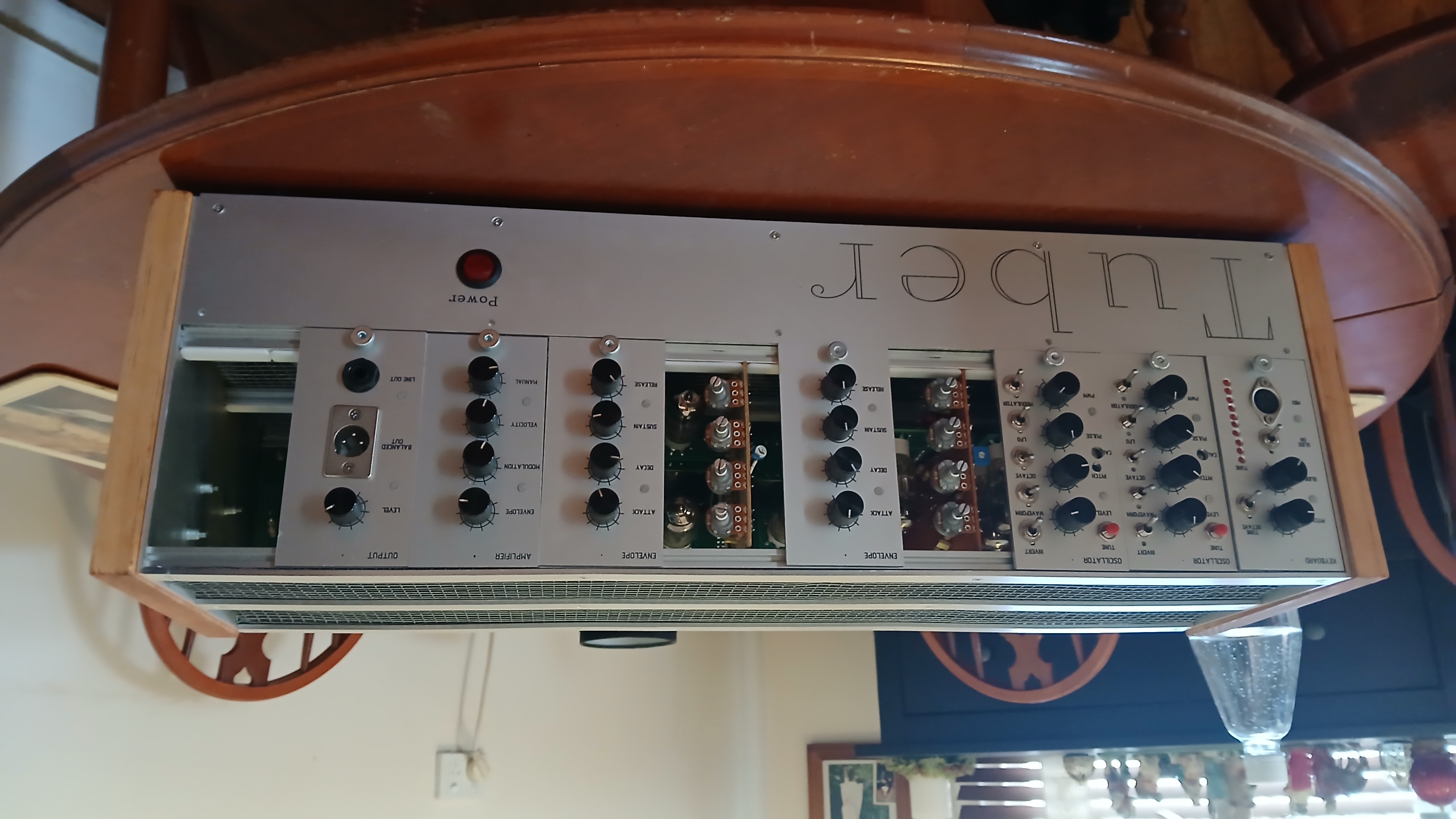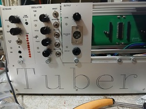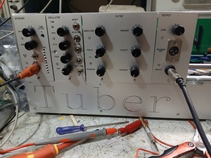 The Tuber Synthesizer is a valve, subtractive, monophonic, semi-modular synthesizer. It uses a Phantastron based voltage controlled oscillator and a four valve Sallen-Key voltage controlled filter.